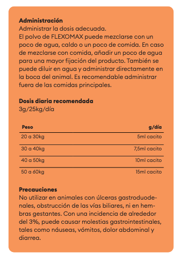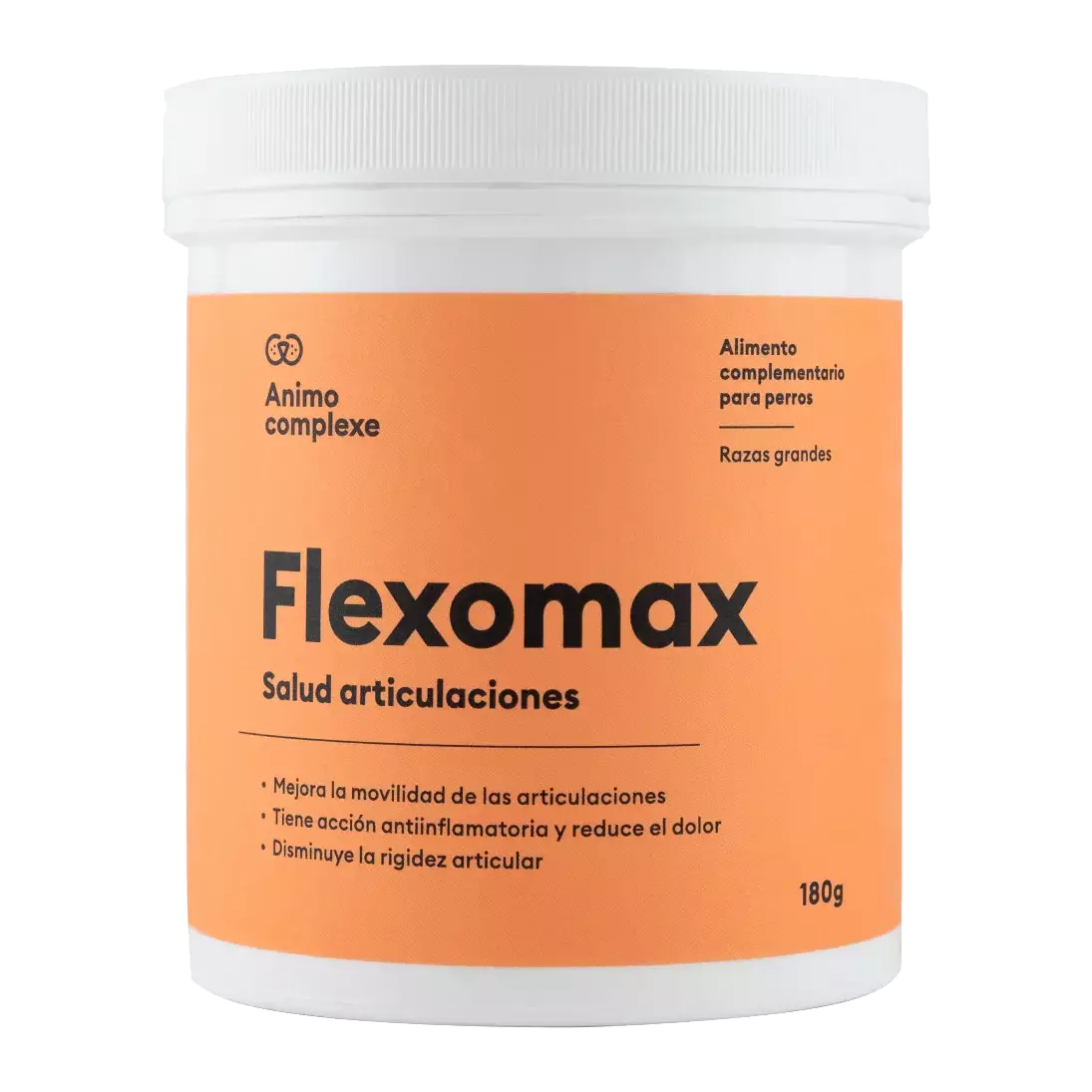 Flexomax es un suplemento en polvo formulado para mejorar la salud de las articulaciones en perros de razas grandes. Además de proteger las articulaciones, reduce la inflamación y el dolor, y mejora la movilidad.